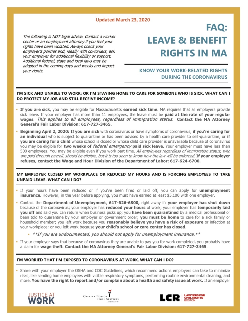 Join Justice at Work, a nonprofit legal services organization, for a workshop on the last Tuesday of each month through Zoom! Registration is a requirement and can be done at (781) 244-3357. Together, we will discuss our rights during this time and answer questions about our health, safety, wages, and more. FREE!